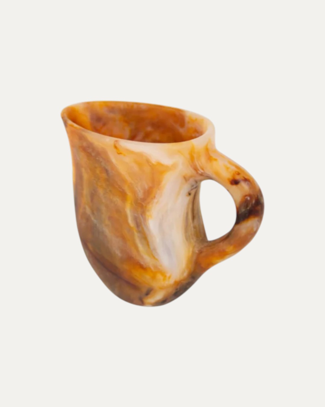 Jarro em resina com um padrão marmorizado em tons de mel. Devido à natureza da resina, podem ocorrer variações de cor, tornando cada produto único.