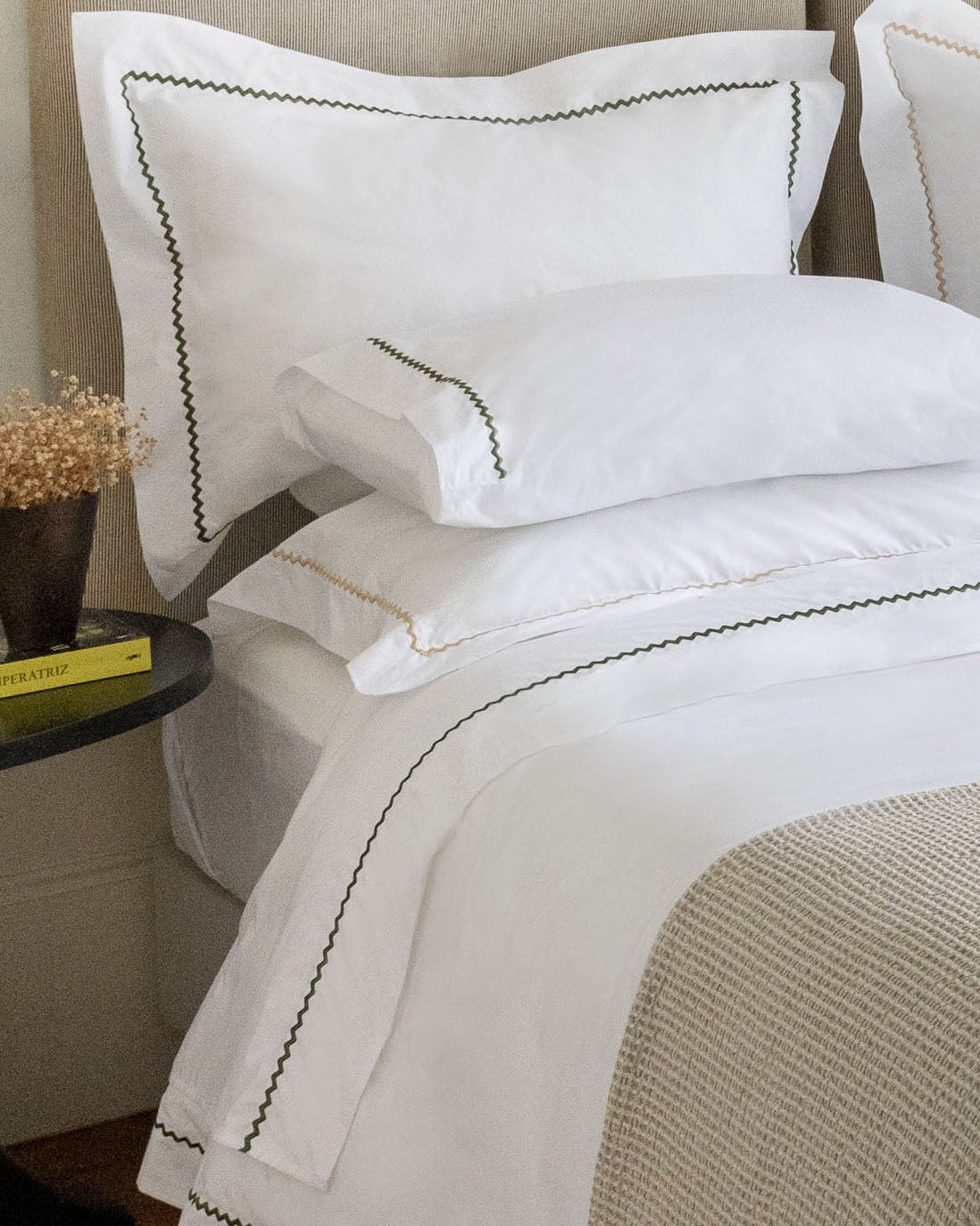 Lençol de cima 100% Algodão em Percal de 200 fios, produzido no norte de Portugal. Design liso com rebordo em zigzag bordado. Disponível em 5 cores.