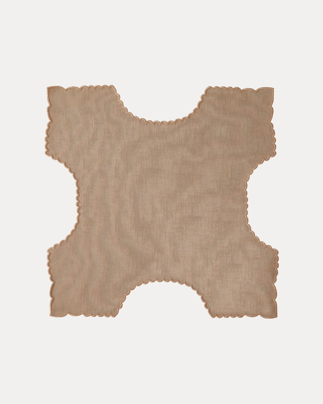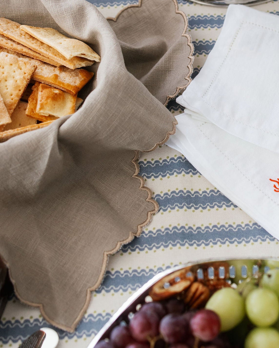 Pano para cesto de pão quadrado em mistura de linho e algodão de cor bege. Apresenta um rebordo ondulado com remate bordado no mesmo tom.