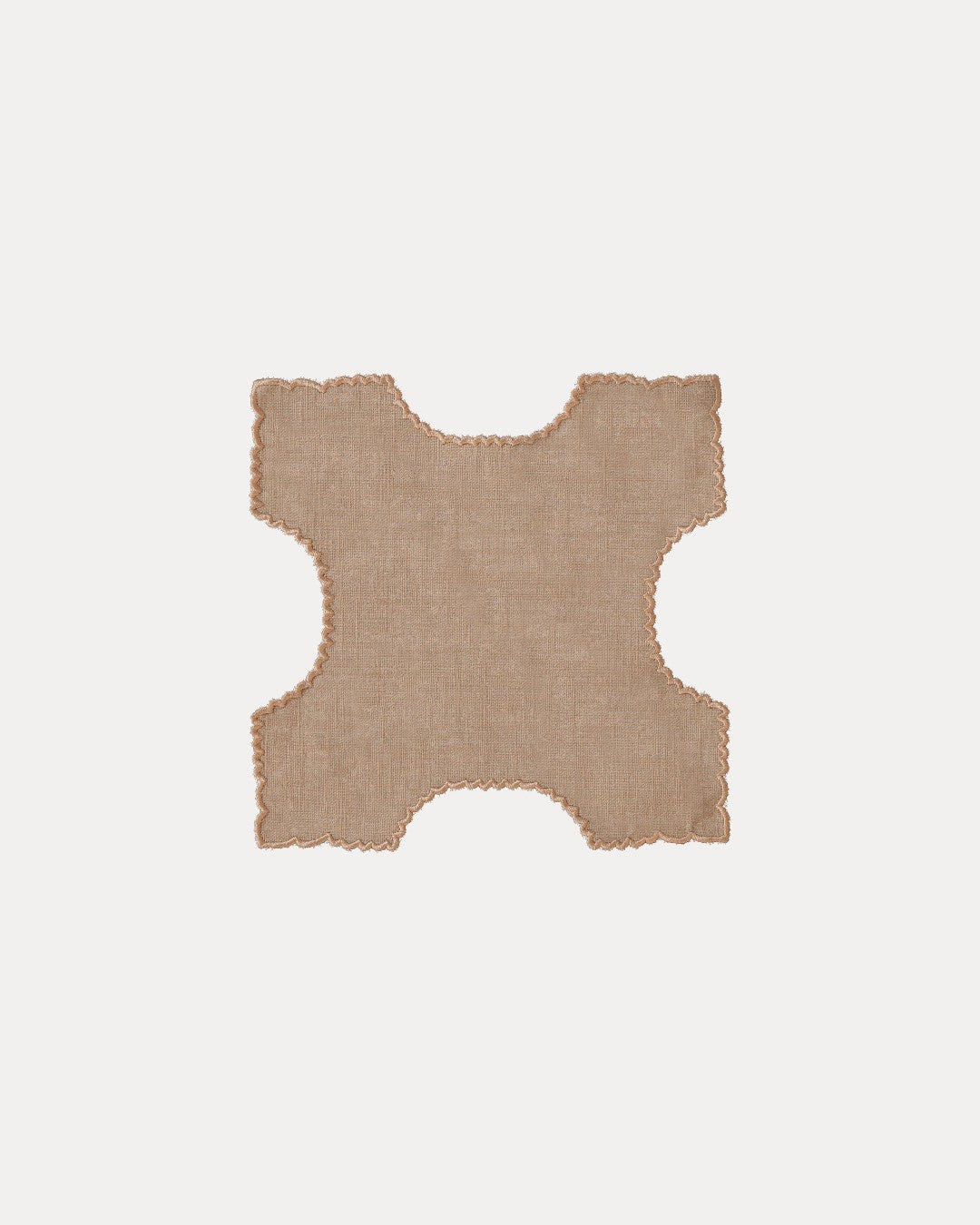 Pano para jarro em mistura de linho e algodão de cor bege. Apresenta um rebordo ondulado com remate bordado no mesmo tom.