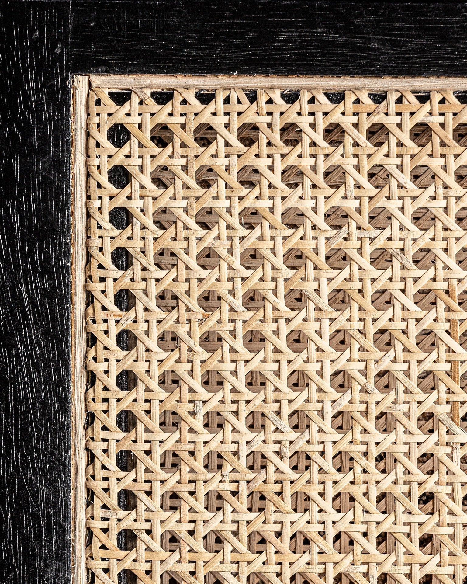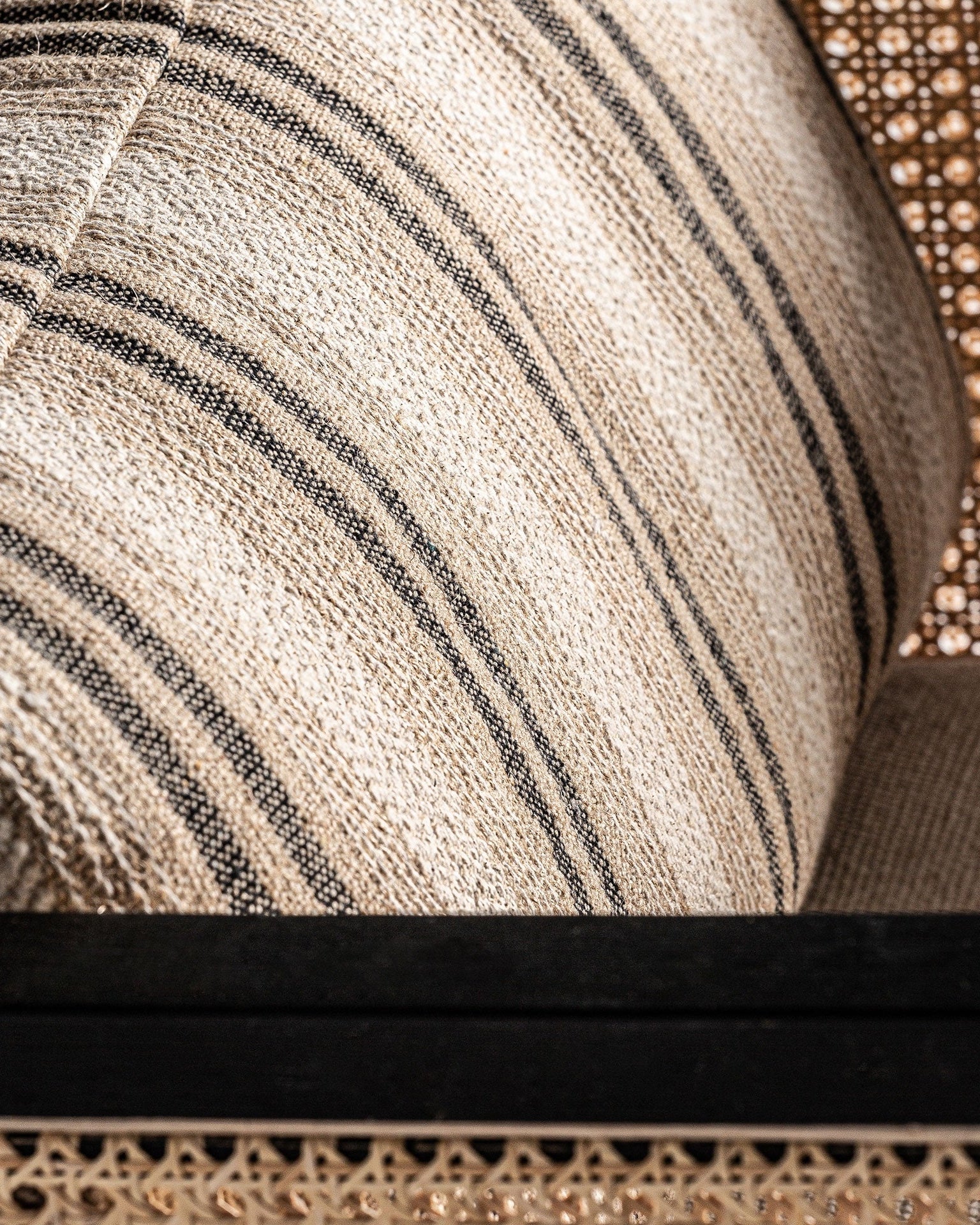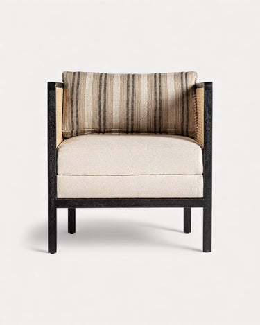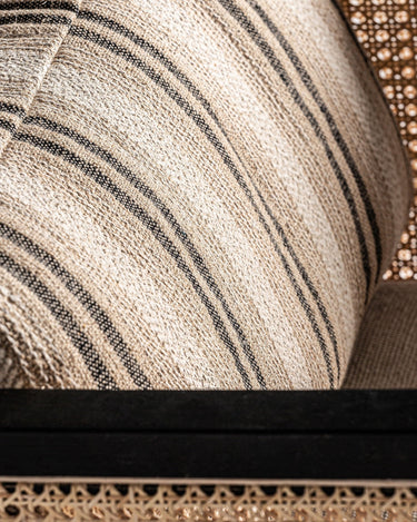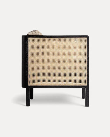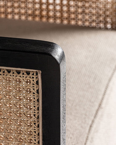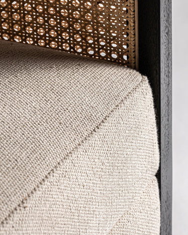 A Poltrona Arven combina estrutura em madeira de manga preta com laterais em rattan natural entrançado. O assento estofado em poliéster bege assegura conforto prolongado, enquanto o contraste entre preto e natural cria um visual sofisticado e versátil.