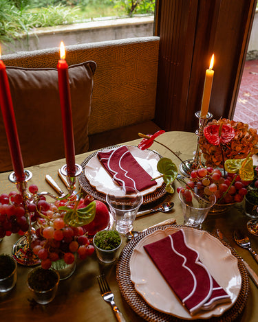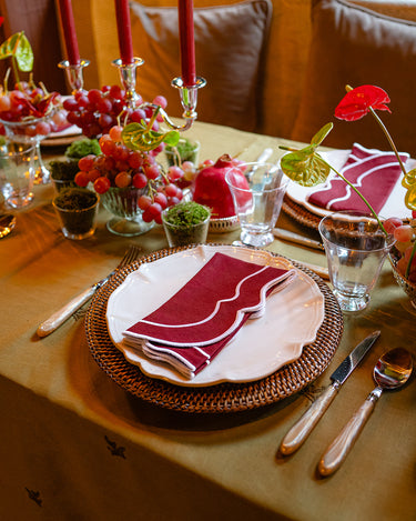 O guardanapo Clou apresenta um design romântico com bordas arredondadas, perfeito para adicionar um toque de delicadeza à sua mesa. Agora disponível na elegante cor bordeaux natalícia, ideal para celebrar a época festiva com charme e sofisticação.
